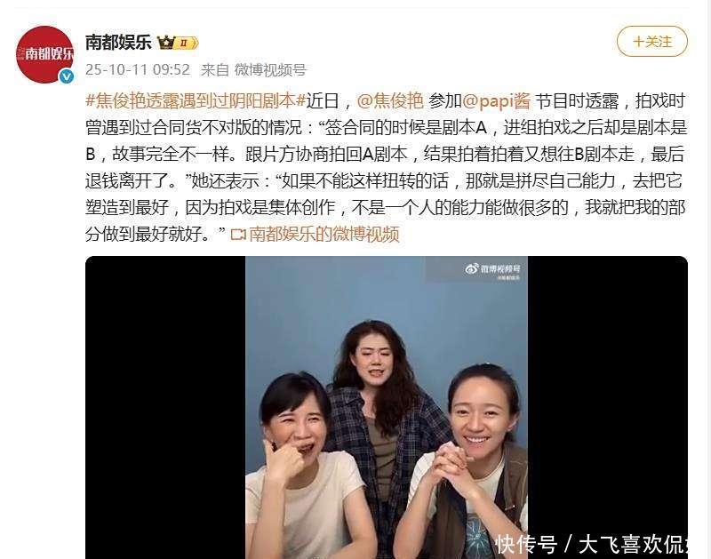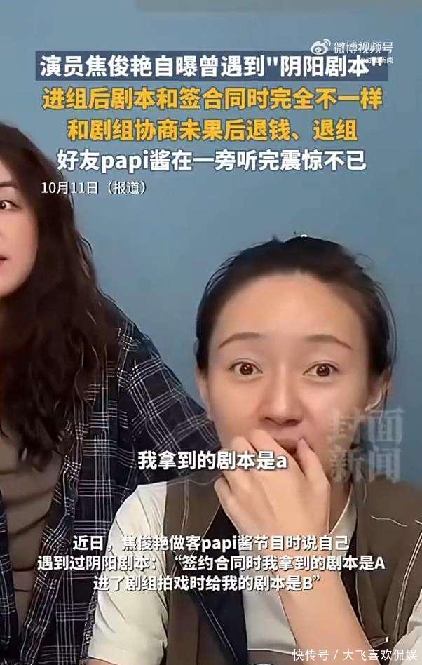 10月11日,有媒体报道,演员焦俊艳在节目中自曝拍摄经历,直接捅破了“阴阳剧本”这层窗户纸——签合同时敲定的是剧本A,进组后竟被偷换成剧本B,故事彻底变样。协商无果后,她直接选择退钱、退组,用行动硬刚行业乱象。